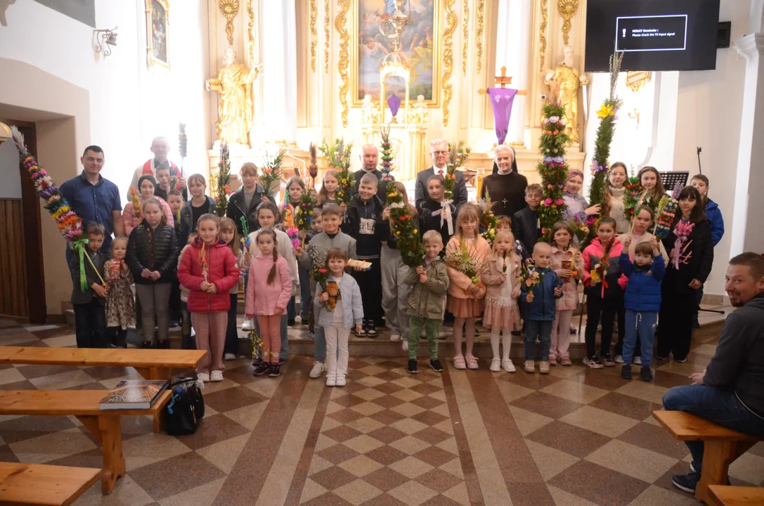 Zaraz po Mszy Świętej parafianie wzięli udział w konkursie palm wielkanocnych, który przyciągnął wielu młodych uczestników. Każda palma była wyjątkowa, pełna kolorów, kwiatów i tradycyjnych ozdób.