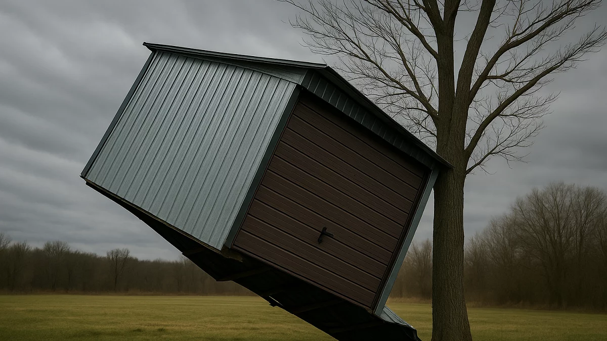 W sumie strażacy otrzymali 12 zgłoszeń. Jedno z nich dotyczyło niebezpiecznej sytuacji w gminie Turobin, gdzie silny podmuch wiatru porwał wolnostojący blaszany garaż, który zatrzymał się na drzewie przy drodze powiatowej:
