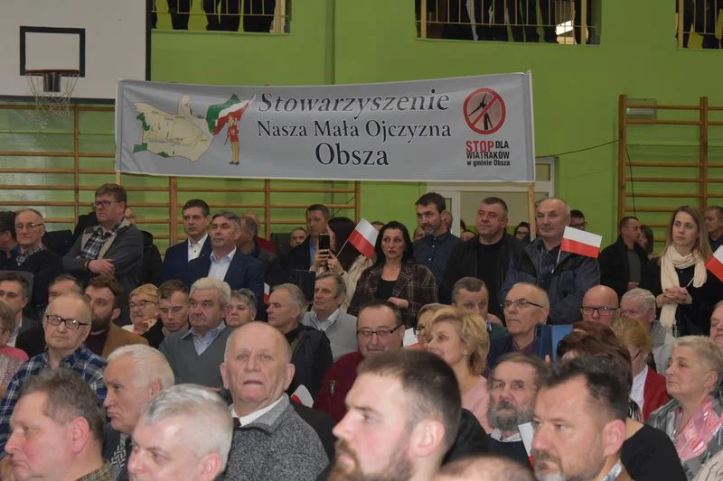 Na spotkaniu pojawili się również mieszkańcy Obszy z banerami wyrajającymi sprzeciw przeciwko budowie farmy wiatrowej w gminie Obsza. Przedstawiciel protestujących opisał sytuację. Mówił, że kraje zachodnie blokują budowę farm wiatrowych chociażby dlatego, że zakłócają pracę radarów wojskowych: