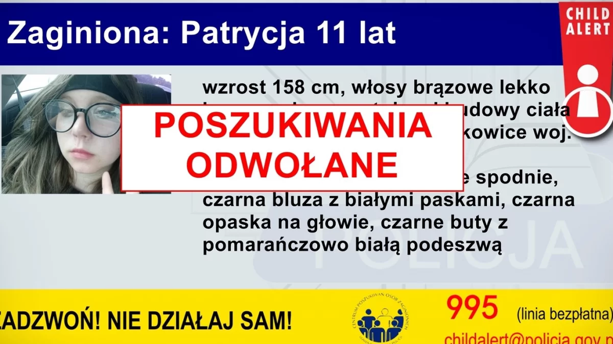 Zaginiona to 11-letnia Patrycja. Dziewczynka zaginęła 13 maja w Dziewkowicach w województwie opolskim. Po wizycie u dziadków nie powróciła do rodzinnego domu i nie nawiązała kontaktu z rodziną.