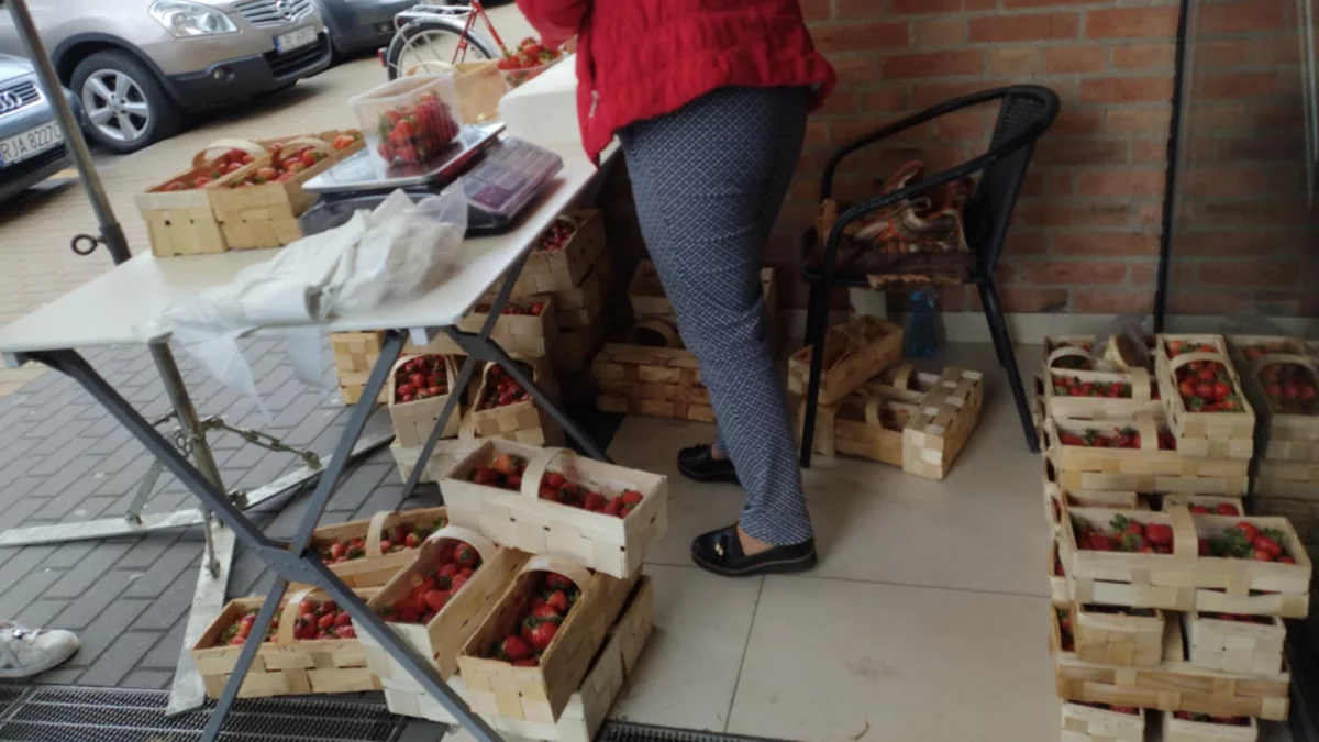 Cena na stoiskach w Biłgoraju już nieco spadła. Dziś było to 25 zł/kg. Zainteresowanie truskawkami jest spore.