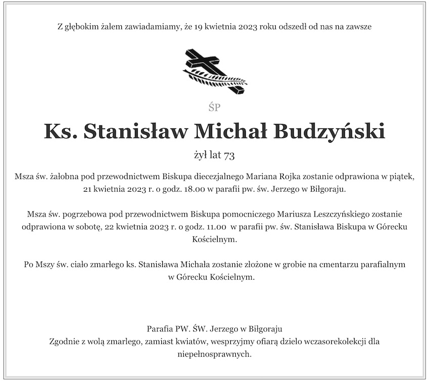 Ksiądz Stanisław Michał Budzyński to były proboszcz parafii św.Jerzego w Biłgoraju, oraz wikariusz parafii w Górecku Kościelnym i Józefowie. Ostatnie miesiące życia spędził w szpitalach. Zmarł po długiej i ciężkiej chorobie w Szpitalu Wojewódzkim Jana Pawła II w Zamościu. Miał 73 lata.